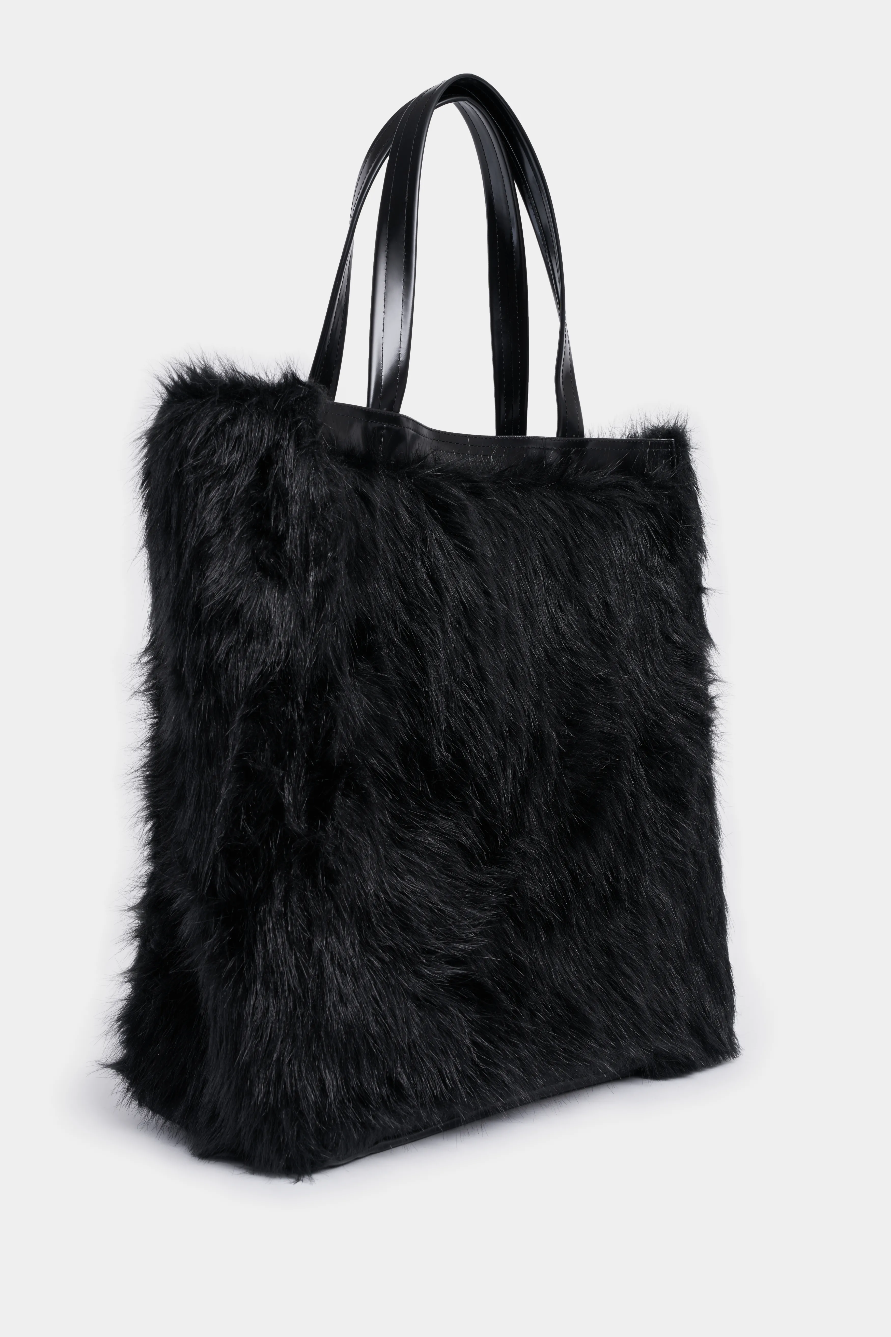 Stylist Faux is an extra-large tote bag covered in long-haired black faux fur. The base is crafted in dense and sturdy w…